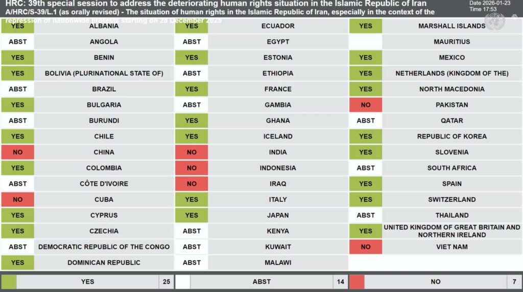 At a special session held in Geneva on January 23, 2026, the Council voted to extend the mandate of the UN Special Rapporteur on Iran for one year and the Independent International Fact-Finding Mission on Iran for an additional two years. The resolution passed with 25 votes in favor, 14 abstentions, and 7 votes against.
